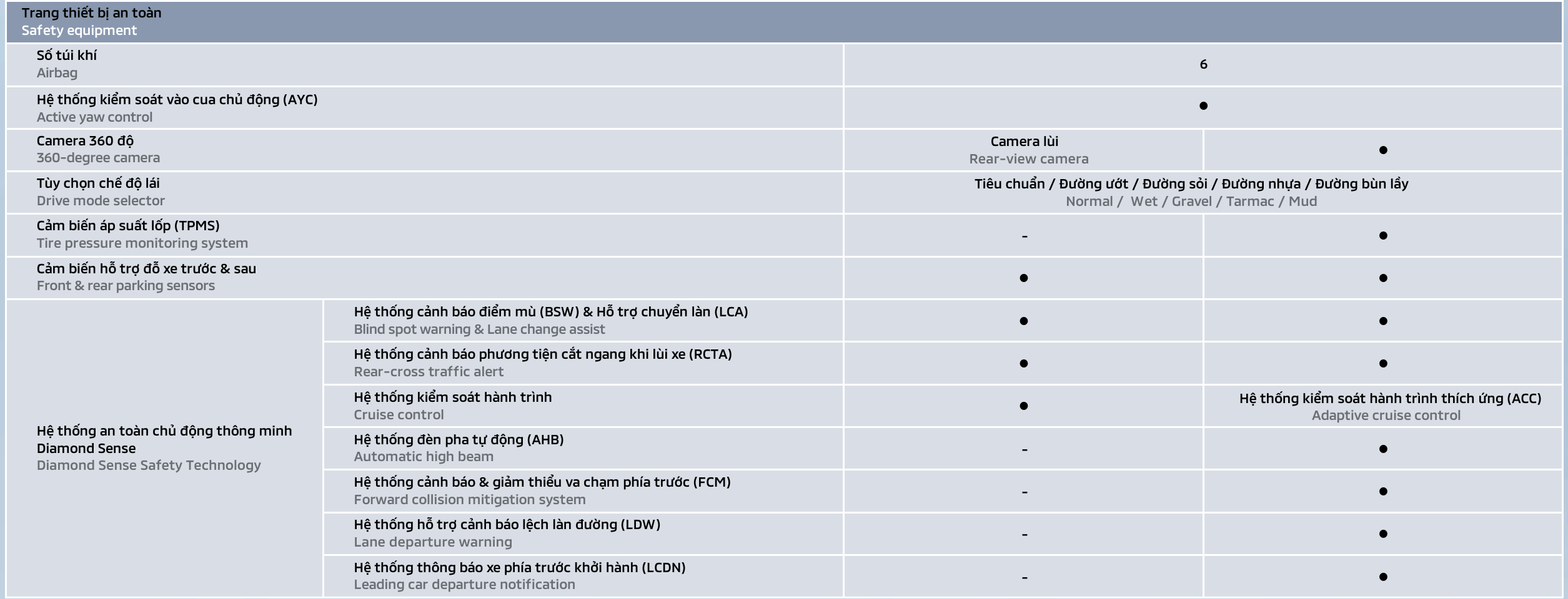 Mẫu SUV này đạt chứng nhận 5 sao ASEAN NCAP. Trên các phiên bản gói ADAS Diamond Sense bao gồm các tính năng: cảnh báo điểm mù, hỗ trợ chuyển làn, cảnh báo phương tiện cắt ngang khi lùi, cảnh báo và giảm thiểu va chạm phía trước, cảnh báo lệch làn, kiểm soát hành trình thích ứng và thông báo xe phía trước khởi hành. Trong khi đó, bản Premium chỉ được trang bị ba tính năng ADAS đầu tiên. Xe còn được trang bị camera toàn cảnh 360 độ (tùy phiên bản), cảm biến áp suất lốp, cảm biến hỗ trợ đỗ xe trước/sau và 6 túi khí.